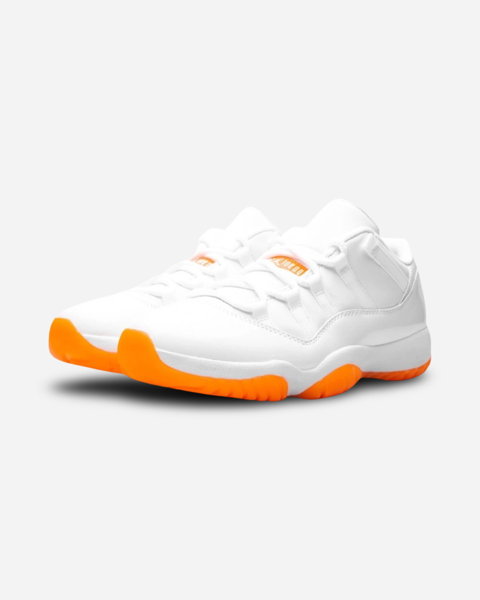 The Women’s Air Jordan 11 Retro Low 'Bright Citrus' revives a simplistic two-tone colorway initially released in 2001 and previously reissued in 2015 as a kids’ exclusive. The low-top utilizes a white leather upper with webbing lace loops and a shiny patent leather overlay in a matching white finish. Vibrant orange accents stand out on the sneaker’s branding elements, including an embroidered Jumpman on the heel tab. Lightweight cushioning is provided by a Phylon midsole, reinforced underfoot by a carbon fiber spring plate and a translucent orange rubber outsole.