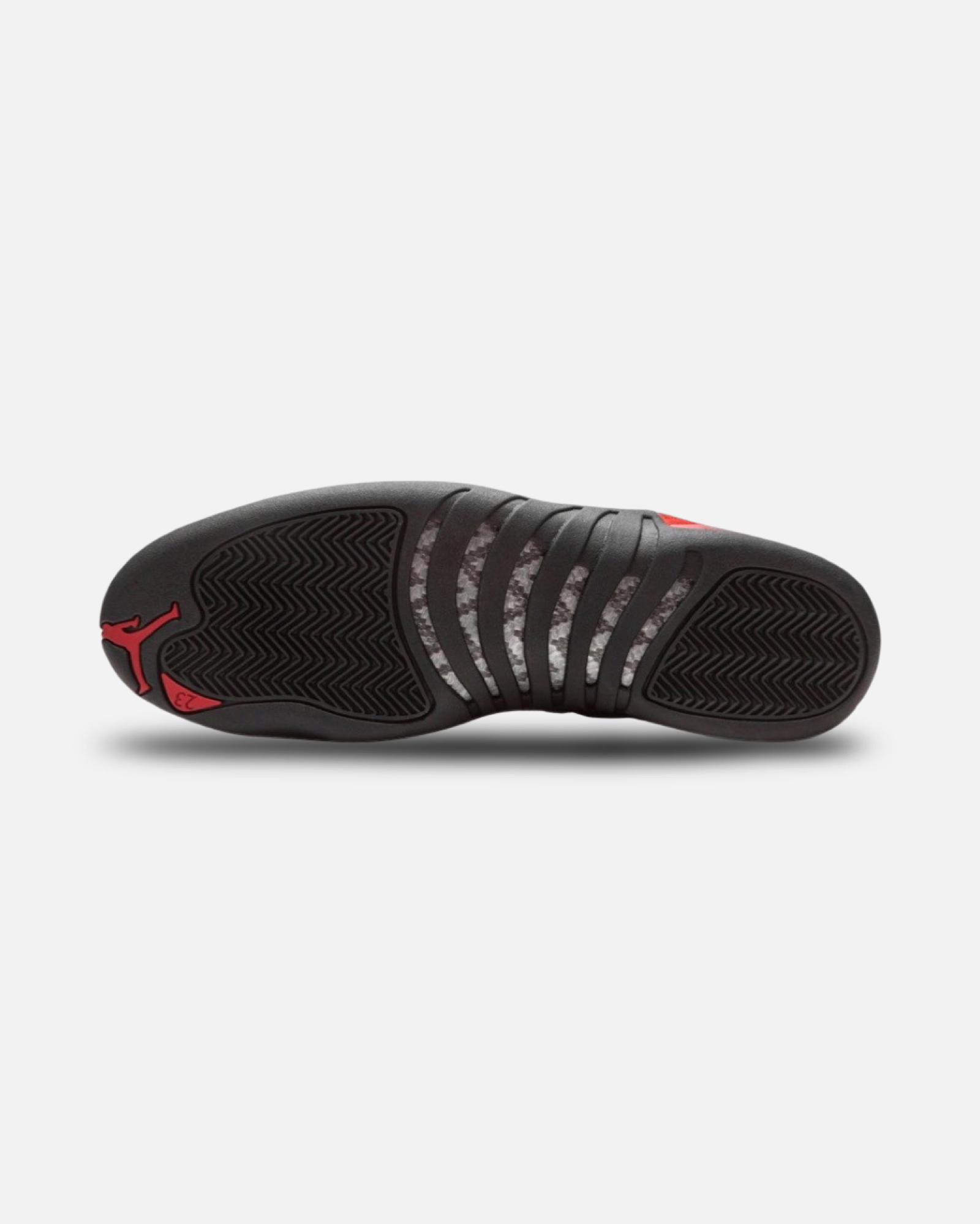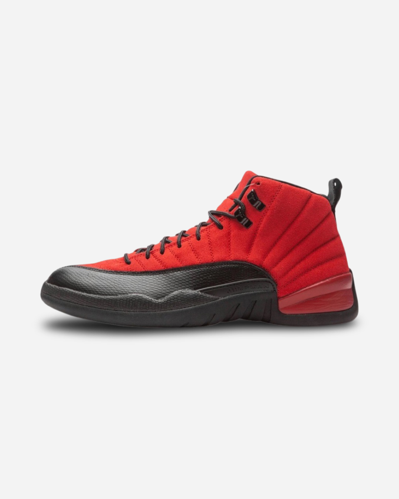 The Air Jordan 12 “Reverse Flu Game” rearranges the color block of an original colorway of Michael Jordan’s twelfth signature shoe. The “Reverse Flu Game” inverts the classic black leather upper and red pattern leather mudguard of the original Jordan 12 worn by Michael most famously during his epic “Flu Game” performance of Game 5 of the '97 NBA Finals. Whereas the original "Flu Game" featured a leather upper, the "Reverse Flu Game" displays a plush Varsity Red suede construction. The mudguard features a contrasting cut of black pebbled leather. The black rope laces sit on top a red suede tongue. A nod to the original design of the Air Jordan 12, the tongue displays a black embroidered Jumpman on the top and black "Two 3" branding beneath the laces. Additional design elements include a carbon fiber midfoot plate, two traction pods on the black outsole, and a red Jumpman on the toe.