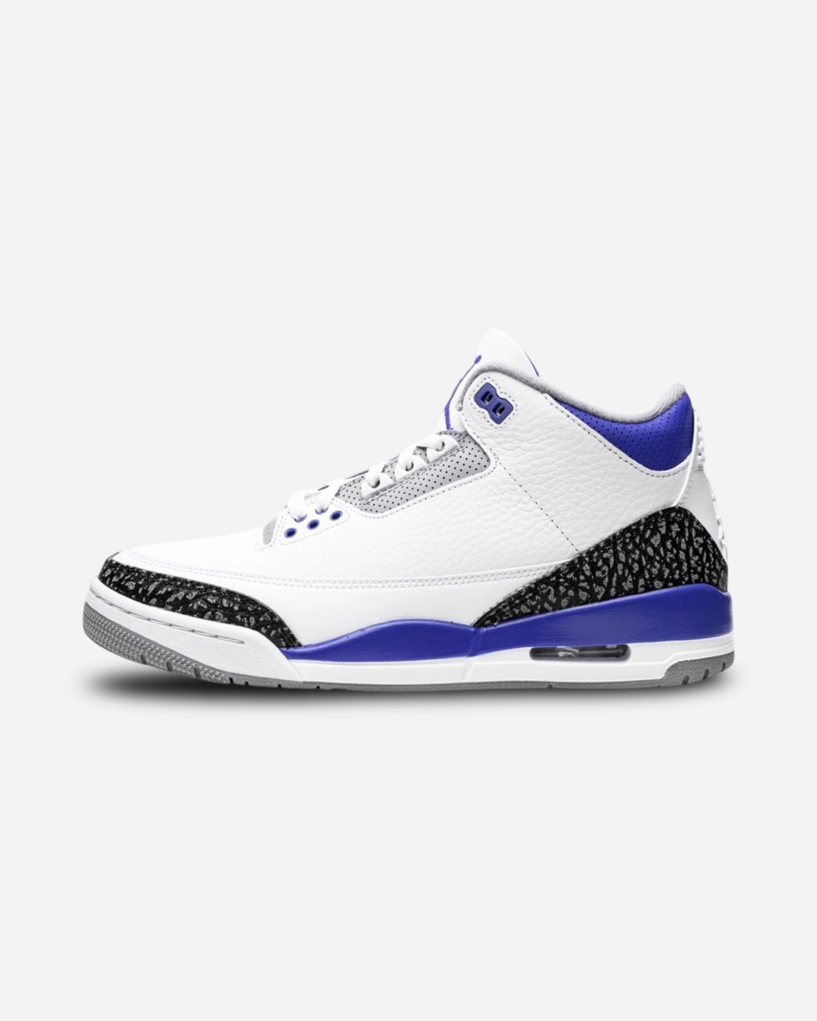 The Air Jordan 3 Retro PS ‘Racer Blue’ features classic color blocking on the silhouette that introduced elephant print to the Jordan franchise. Rendered in a dark grey finish, the distinctive crackle pattern appears on the sneaker’s forefoot and heel overlays, while the rest of the upper is executed in white tumbled leather. Contrasting royal blue accents make their way to eyelets, collar and midsole, as well as Jumpman branding hits atop the tongue and heel.