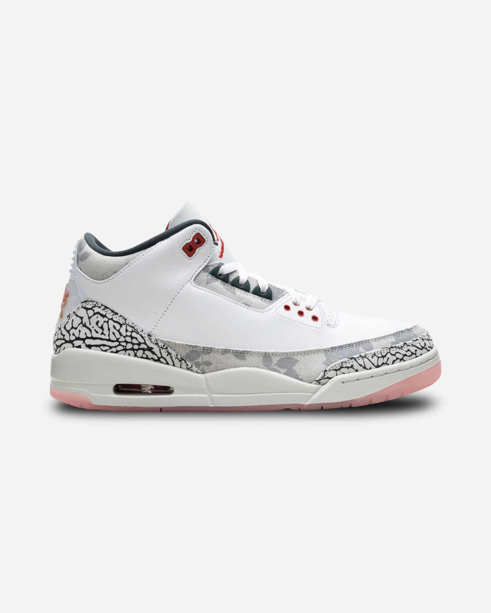 Subtle rosy graphics animate the grey canvas layers on the mudguard, eyestay, and collars, offset by eye-popping red hues encompassing the lace holes, sockliner, and embroidered Jumpman on the tongue.