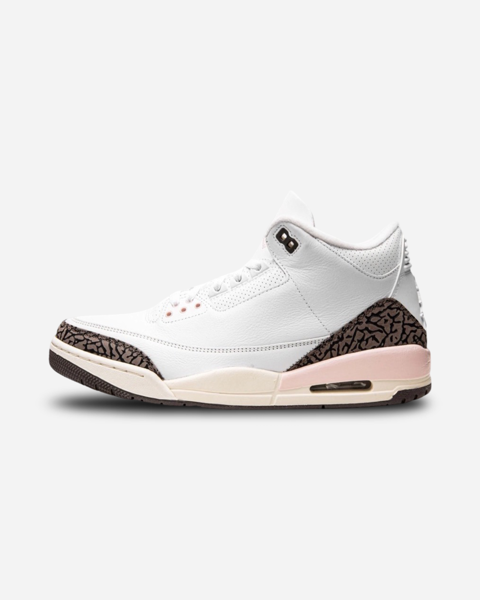 Dressed in a White, Dark Mocha, Atmosphere, and Sail color scheme reminiscent of Neapolitan ice cream. This offering of the Air Jordan 3 features a White leather base with elephant print overlays highlighted with Atmosphere (Pink) contrasting accents. A Dark Mocha rubber outsole completes the design.