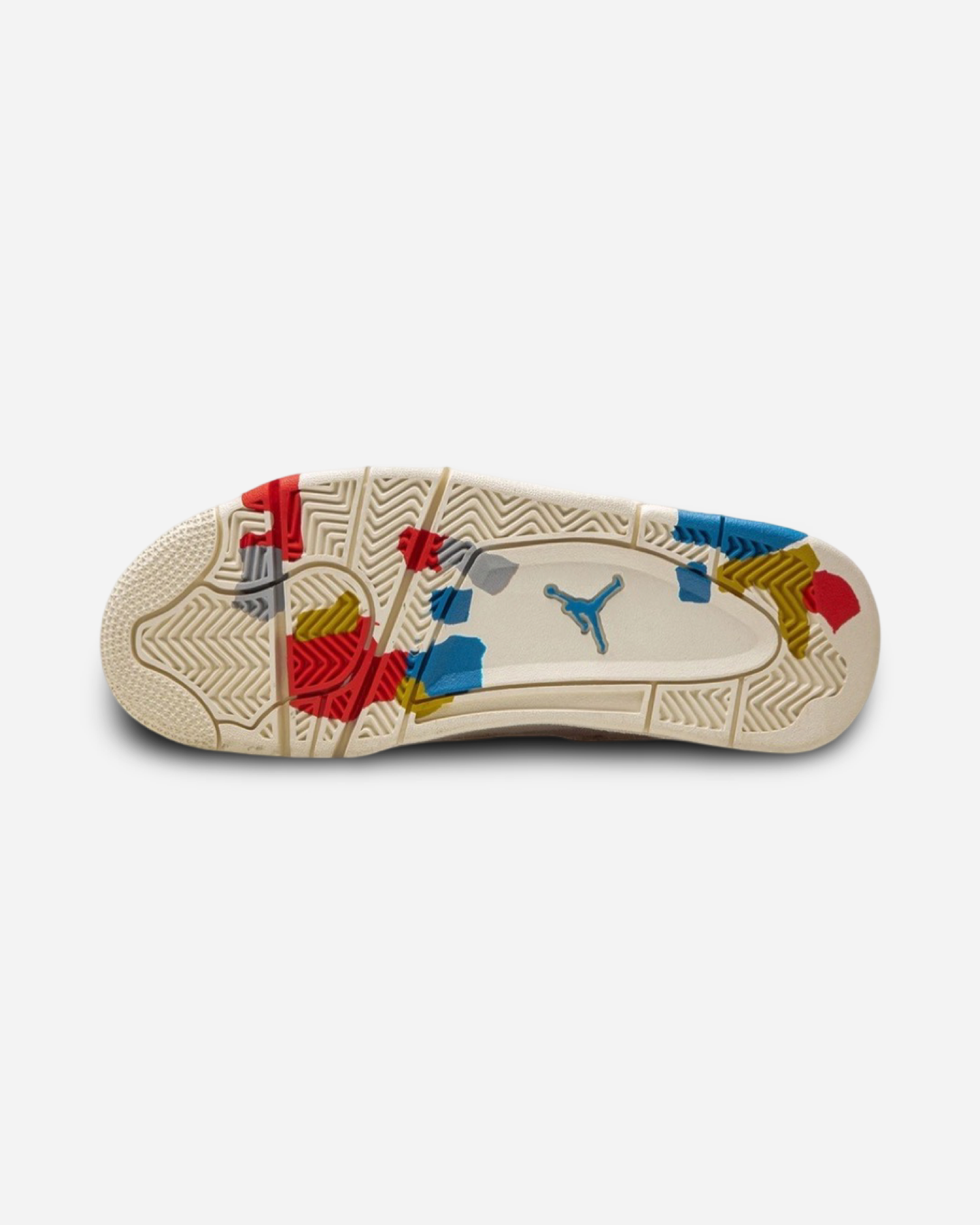 Dressed in a Sail, Cement Grey, and Fire Red color scheme. This Air Jordan 4 swaps out a traditional leather upper and midsole for a clean blank canvas, encouraging customization for the wearer. Additional details includes hits of paint splatter graphics throughout the outsole.