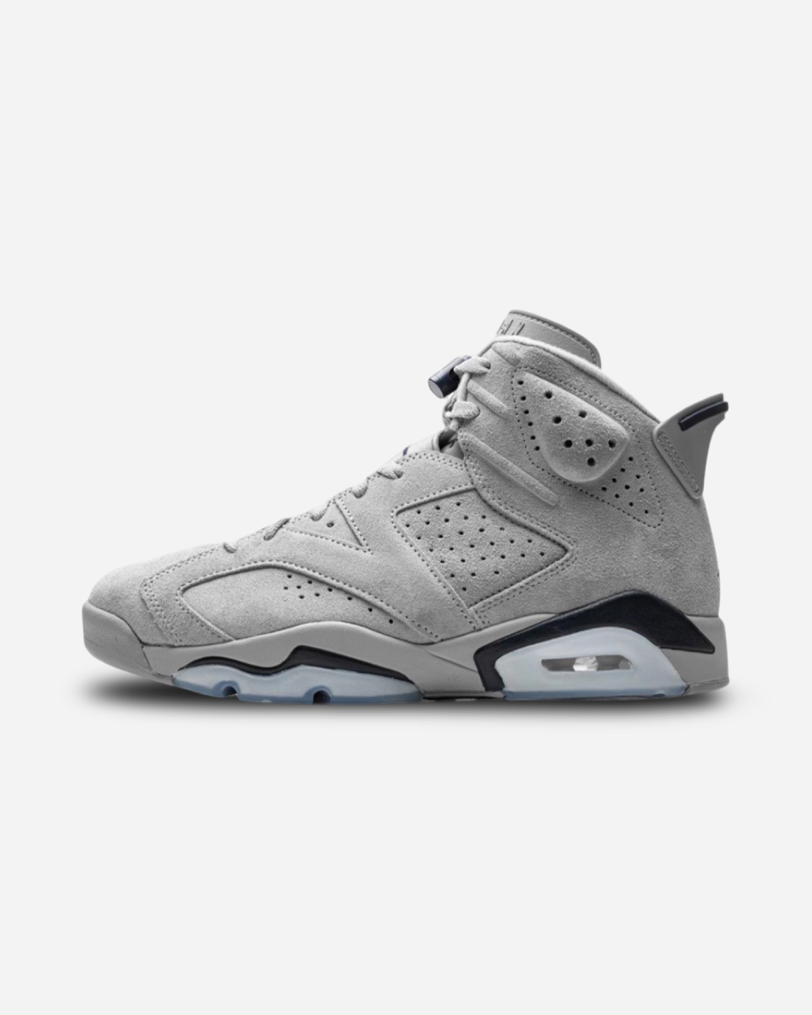 The Air Jordan 6 Retro 'Georgetown' showcases the signature colours of the Hoyas, the team that lost to Michael Jordan’s North Carolina Tar Heels in the 1982 NCAA championship game. The legacy silhouette makes use of a grey suede upper with perforated detailing and a Huarache-like inner sleeve. Contrasting navy accents make their way to the heel tab, lace locks, and Jumpman branding hits embroidered on the tongue and back heel. The sneaker rests on a two-tone polyurethane midsole, featuring a visible Air-sole unit in the heel and a translucent rubber outsole underfoot.