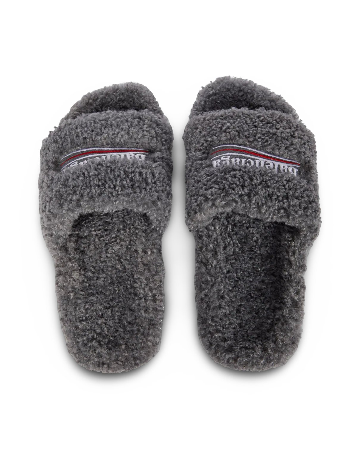 Made in Italy with furry fabric uppers, these Balenciaga slides come in gray and are embroidered with the label's Political Campaign logo.