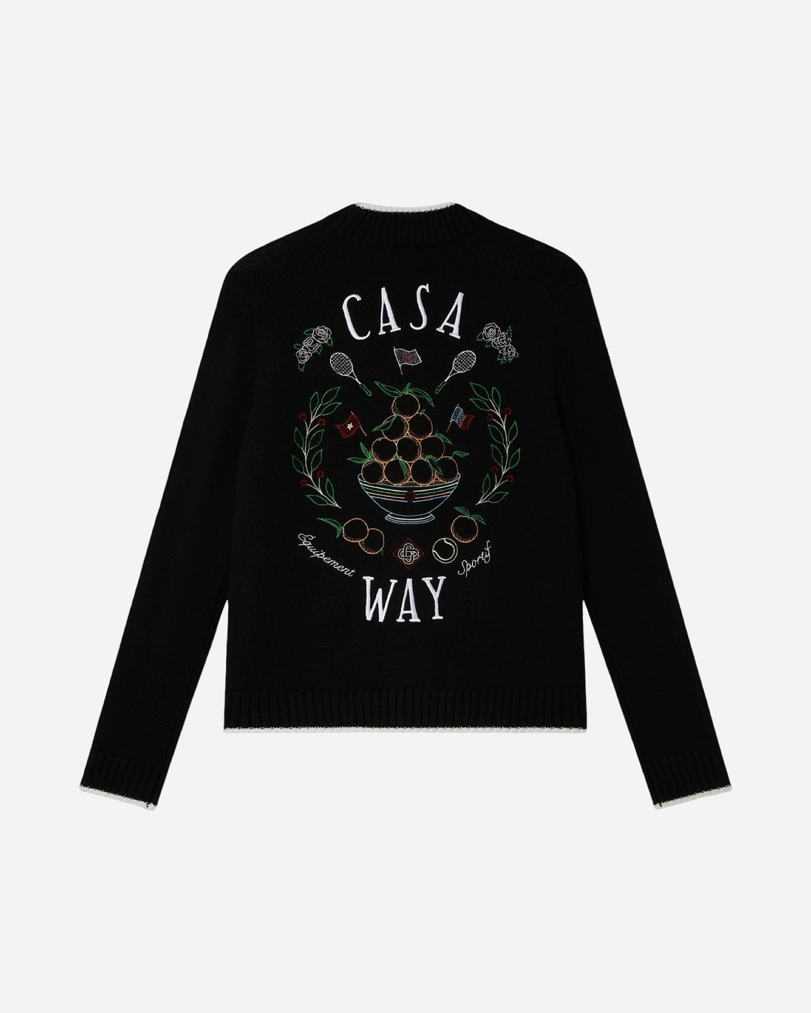 The Casa Way cardigan is a v-neck knitted style crafted from a cashmere blended fabric featuring the house's classic iconographic artwork of the orange pyramid, tennis rackets and floral design on the back. Finished with our signature gold rim pearl buttons, and white detailing on the collar, cuffs, hem and pockets.