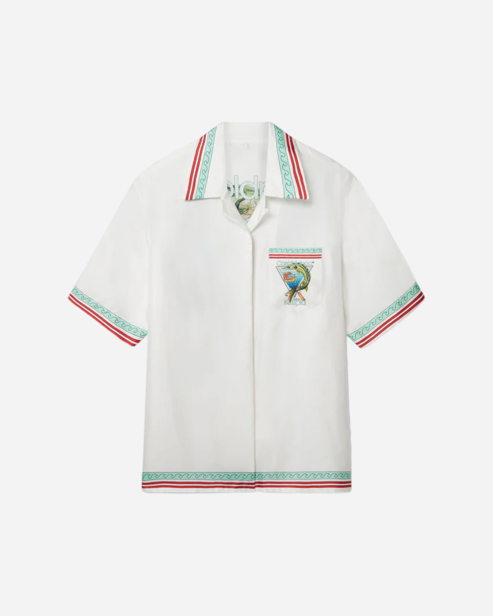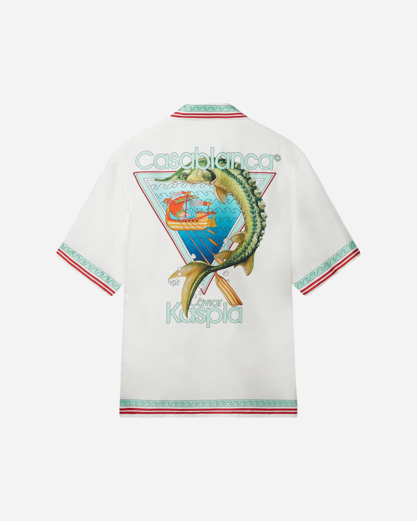 This exclusive short sleeve silk shirt features some of the most famous Kaspia iconography and elements from their visual language, hand-painted in-house by Casablanca. The shirt's design depicts a new take on a classic Casablanca Tennis Club Icon shirt. Complete with blue tonal waves and stripes around the edges and sleeves finished with an open Cuban collar and a Casablanca Paris branded label.