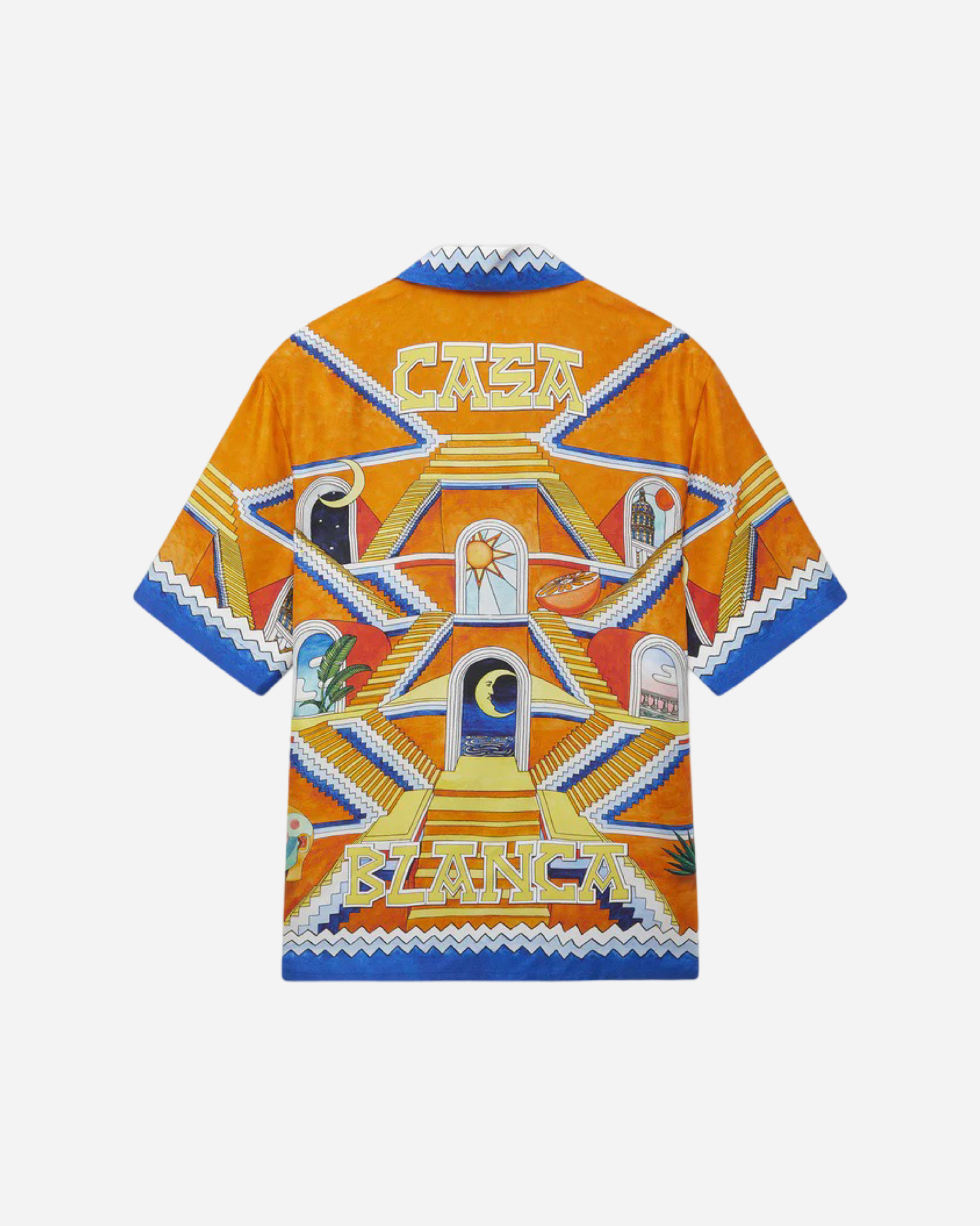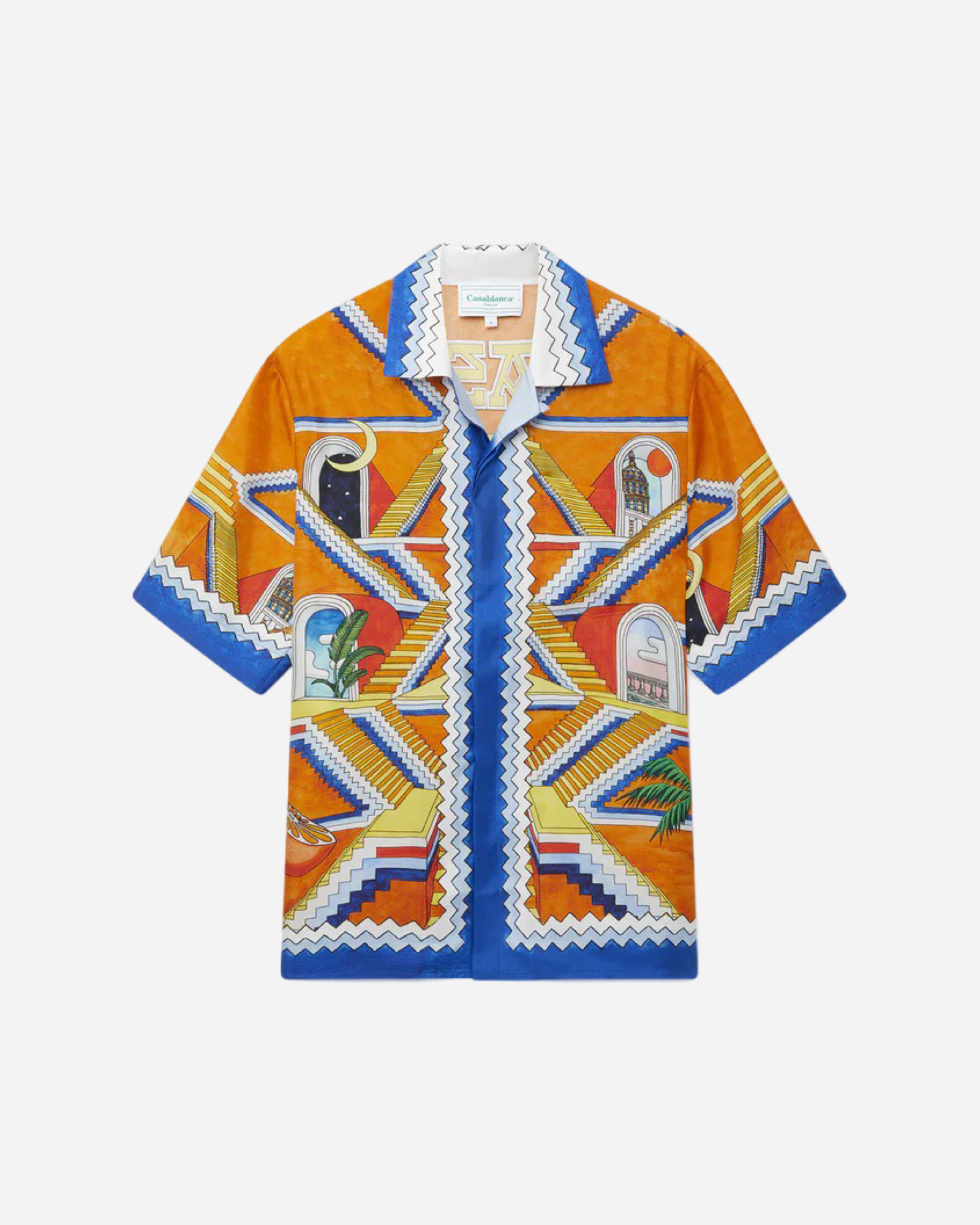 The Escalier Infini silk shirt is a printed short-sleeve style featuring the radiant never-ending staircase artwork that populates the spring/summer 2023 collection. Finished with a contrasting blue and white zig-zag collar, and open collar fastening. This shirt has been tailored for a more contoured fit.