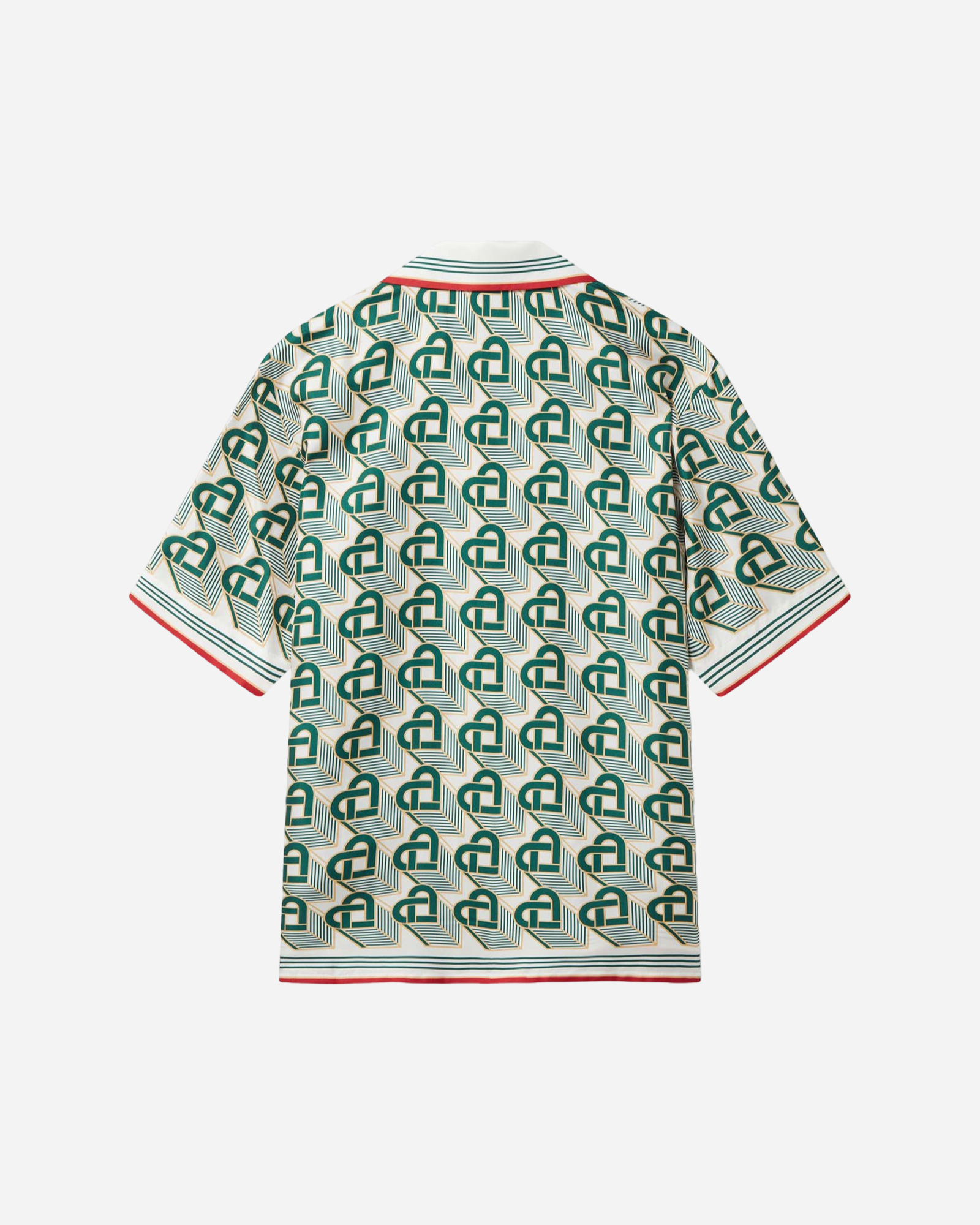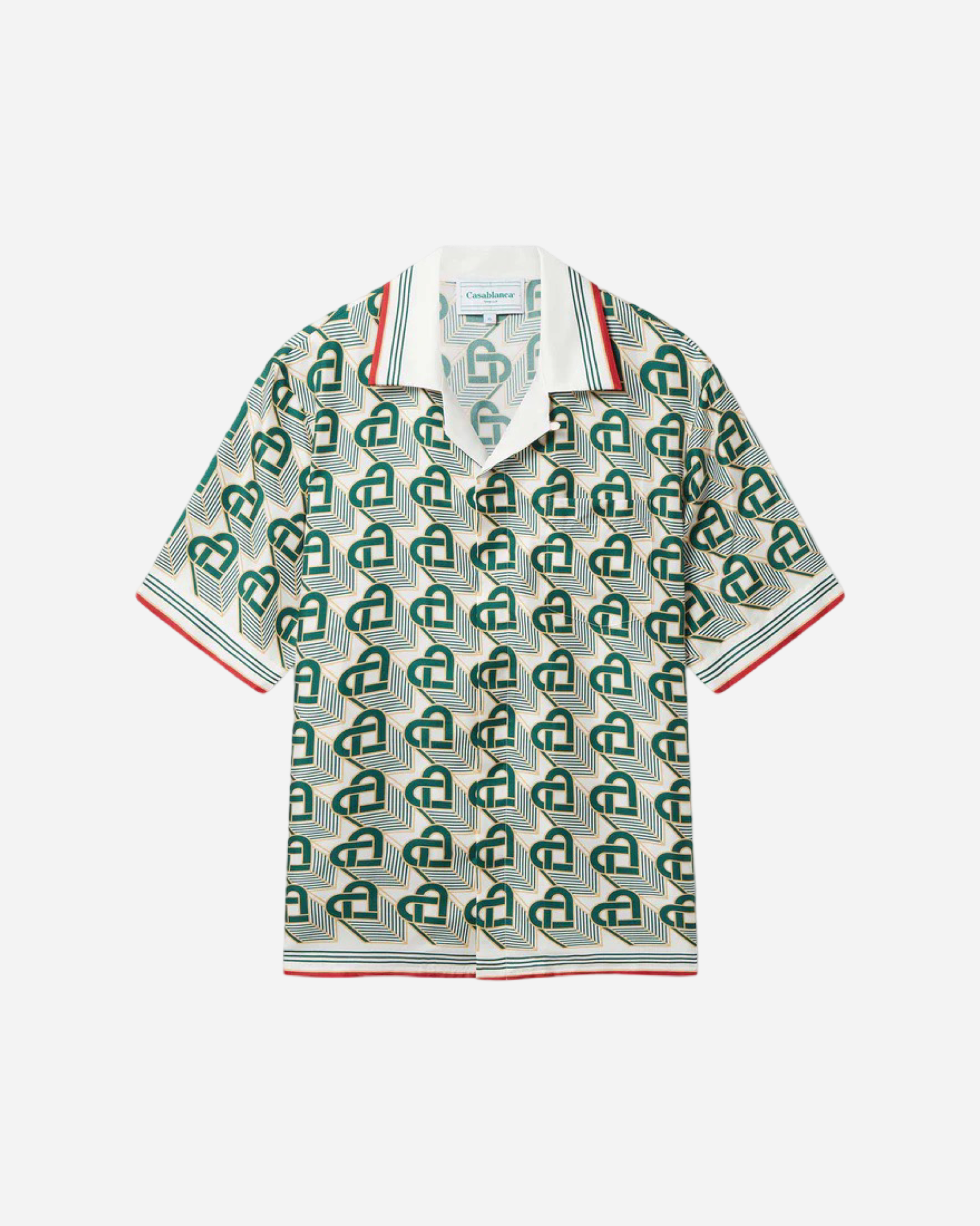 The heart monogram silk shirt is a printed short-sleeve style featuring the all-over green heart monogram artwork with a red contrast hem finish. Completed with a collar intended to be worn open, front button closure and designed for a classic fit.