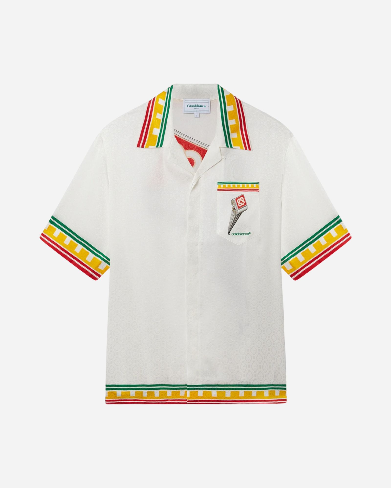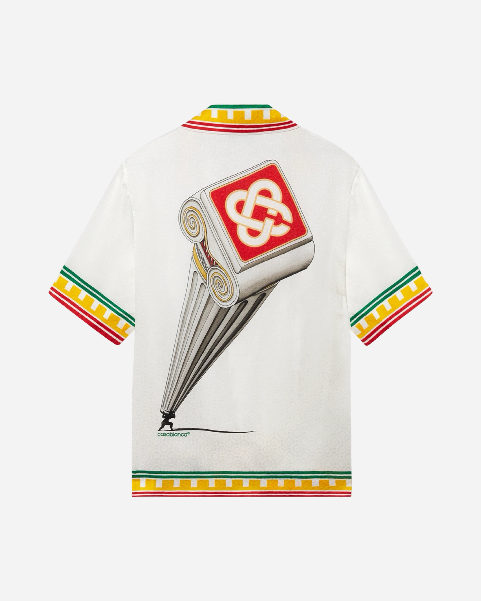 The Leaning Column printed silk shirt is a short-sleeve printed design crafted from a monogram silk twill fabric featuring the house's seasonal artwork inspired by a vintage movie poster and ancient Greece. Completed with button closure, signature interlocking CC corozo buttons, a Cuban collar, and multicolour stripe edge detail on the collar, cuffs, and hem.
