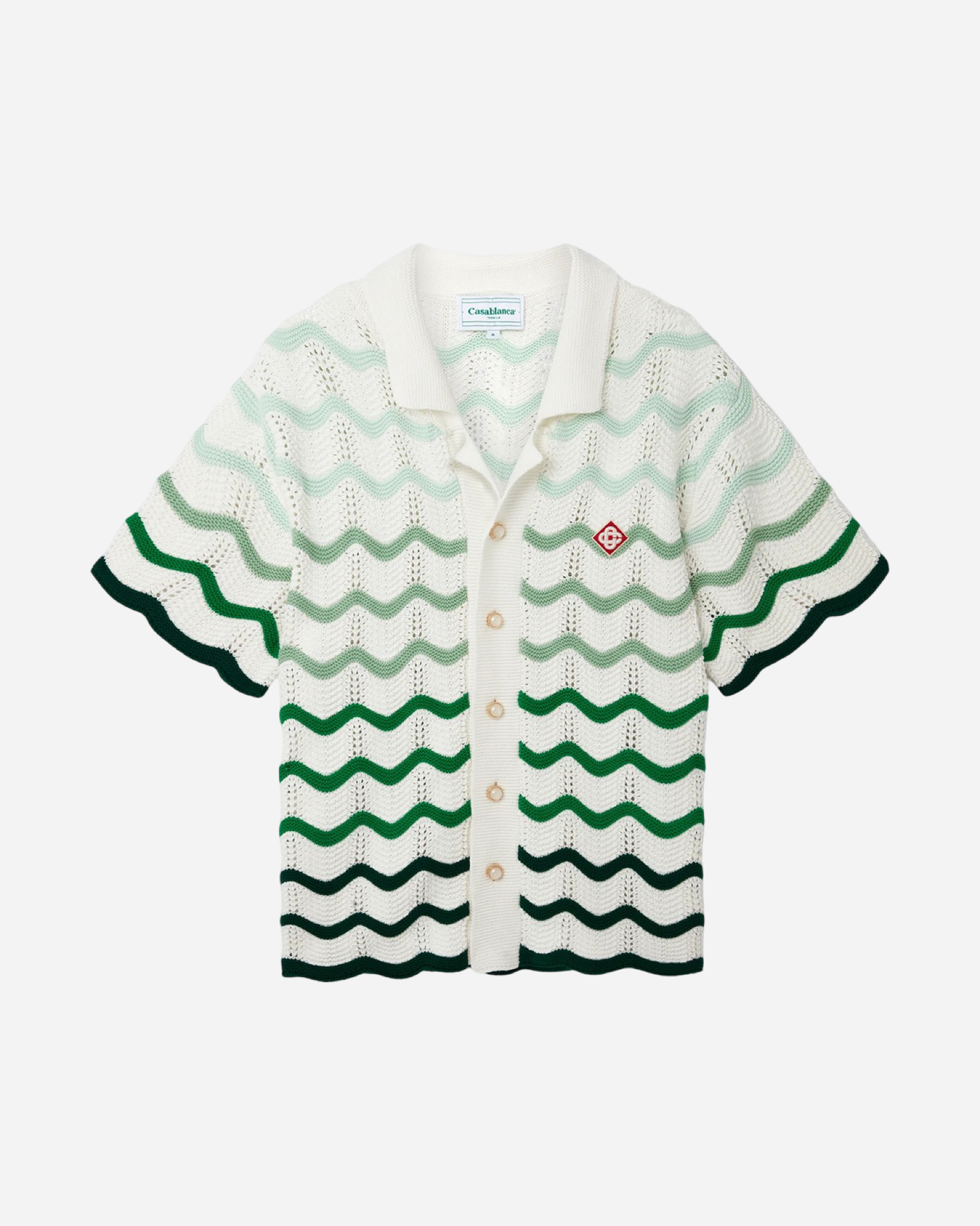The Wavy Gradient Crochet shirt is a classic Casablanca design with a button closure, short sleeves and a Cuban-style collar. Crafted from 100% organic cotton and completed with gold rim signature pearl buttons, the house's diamond logo and Casablanca branded label.