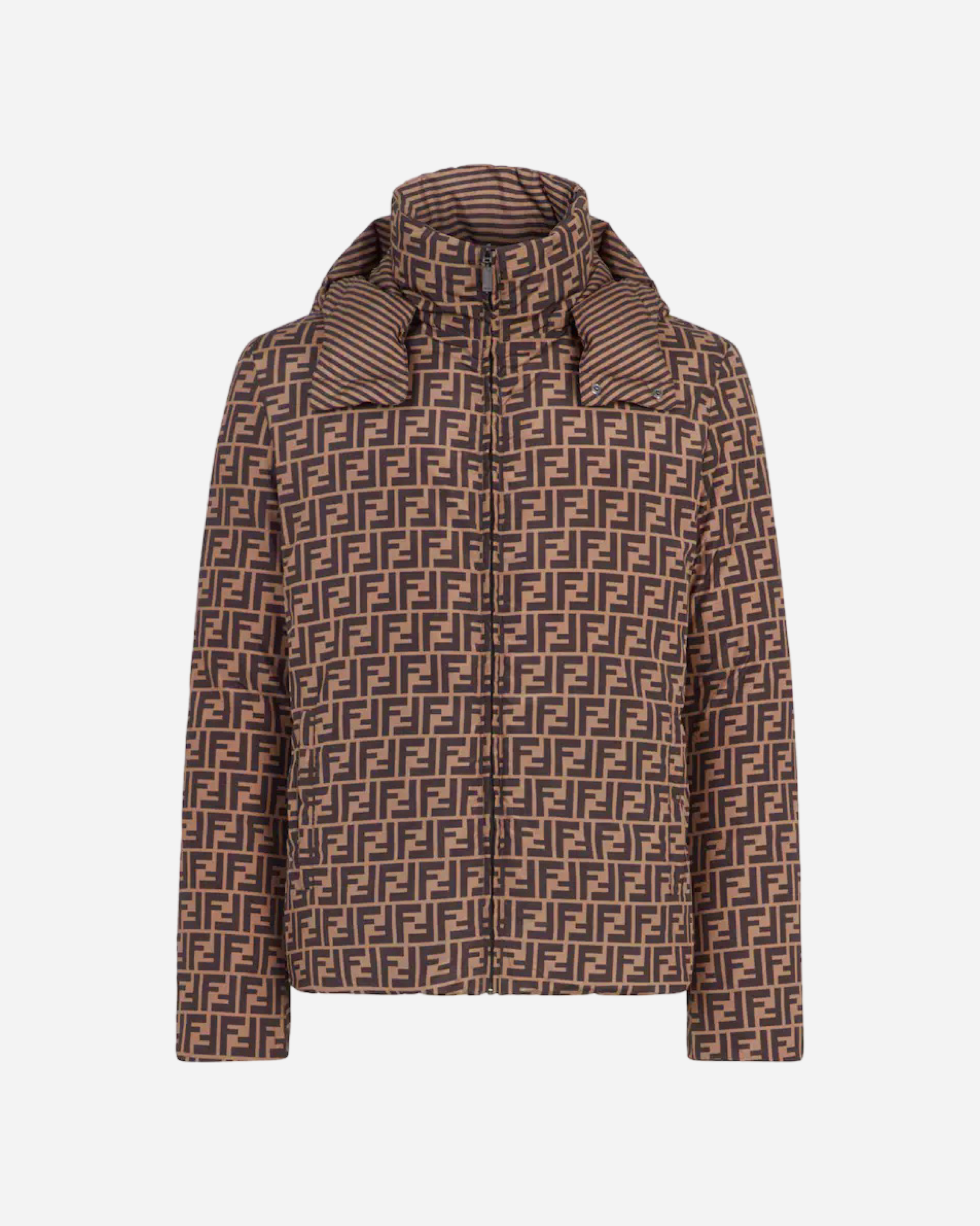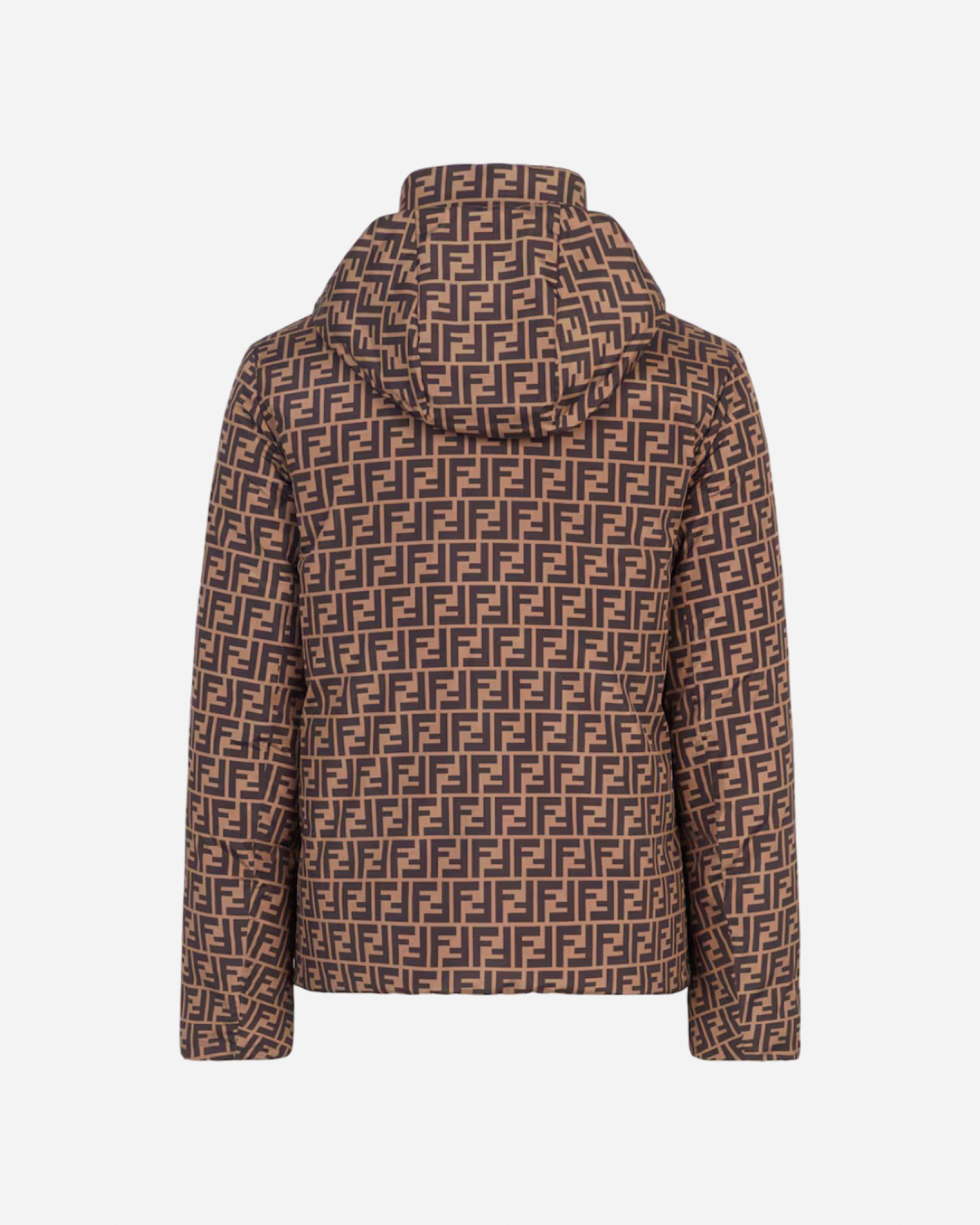 Reversible padded jacket with hood and pockets on both sides. Zip fastening. Made with brown nylon. One side is quilted with a pattern of diagonal lines in tobacco, while the other is customised with an all-over FF motif in the same colours.