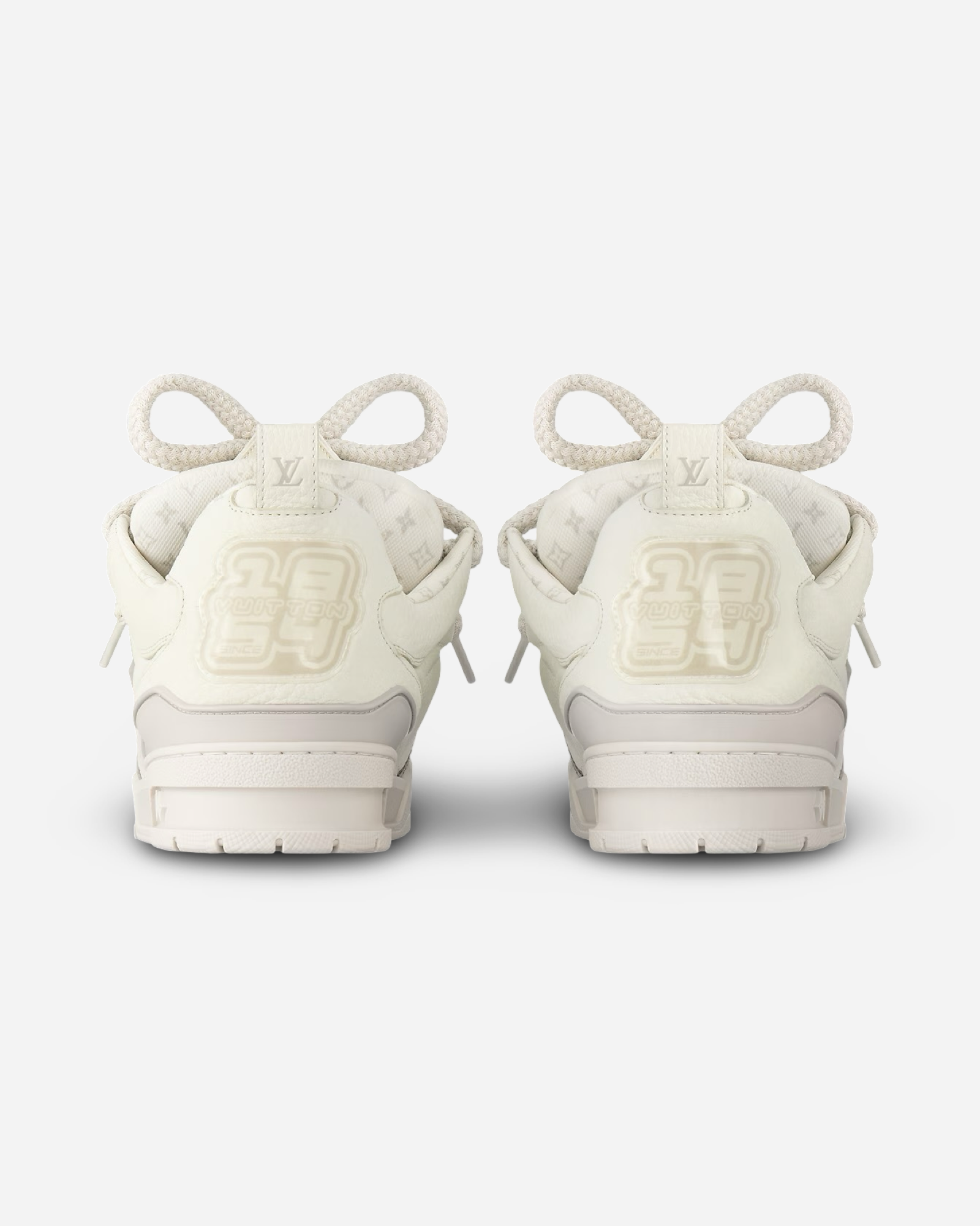 The LV Skate sneaker in grained calf leather draws inspiration from Nineties' skate shoes. Key features of this model are the exaggerated, padded collar and the technical rubber outsole adapted from the LV Trainer sneaker. Distinctive details include the large Monogram Flower on the side and the Vuitton since 1854 signature on the back.