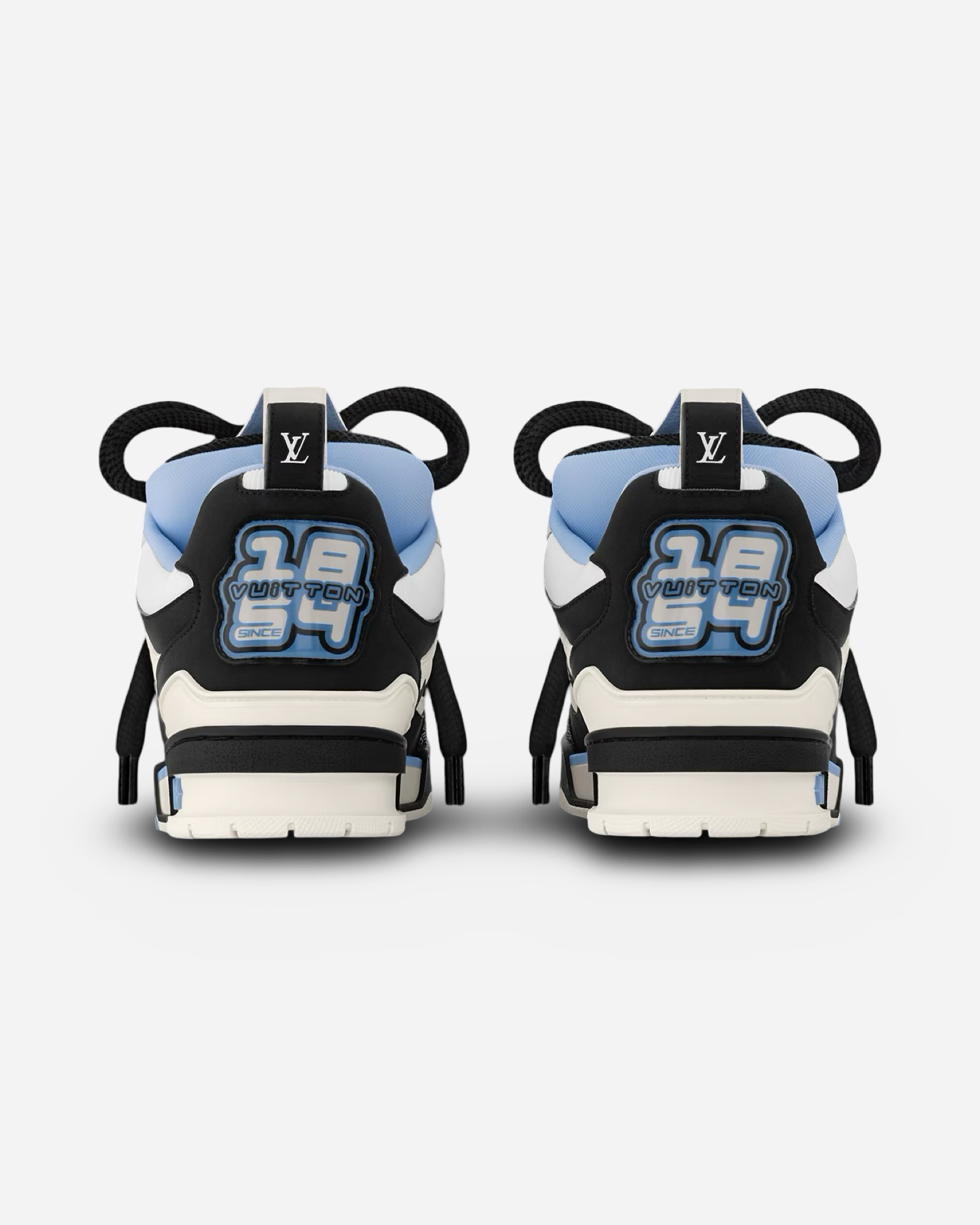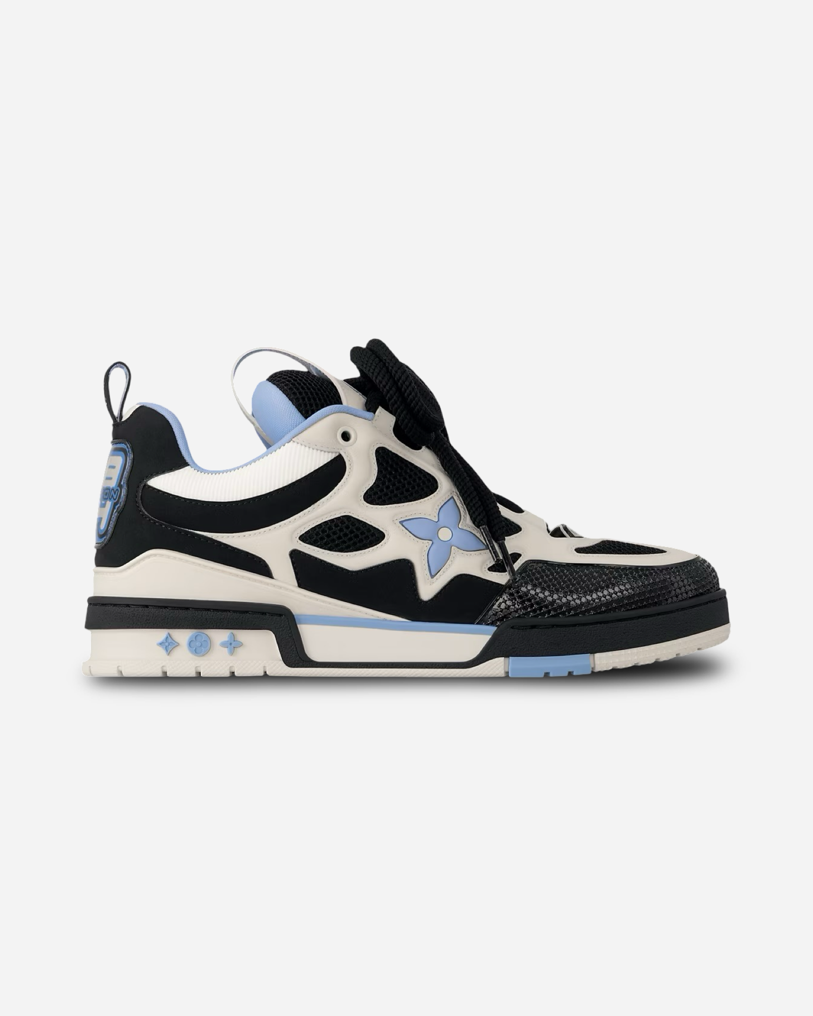 The LV Skate sneaker comes in a mix of materials and a black and white palette illuminated by pops of color. Inspired by Nineties' skate shoes, this model features thick cotton laces and an exaggerated, padded collar and tongue. Key details include a Monogram Flower on the side and an LV Vuitton signature on the tongue.