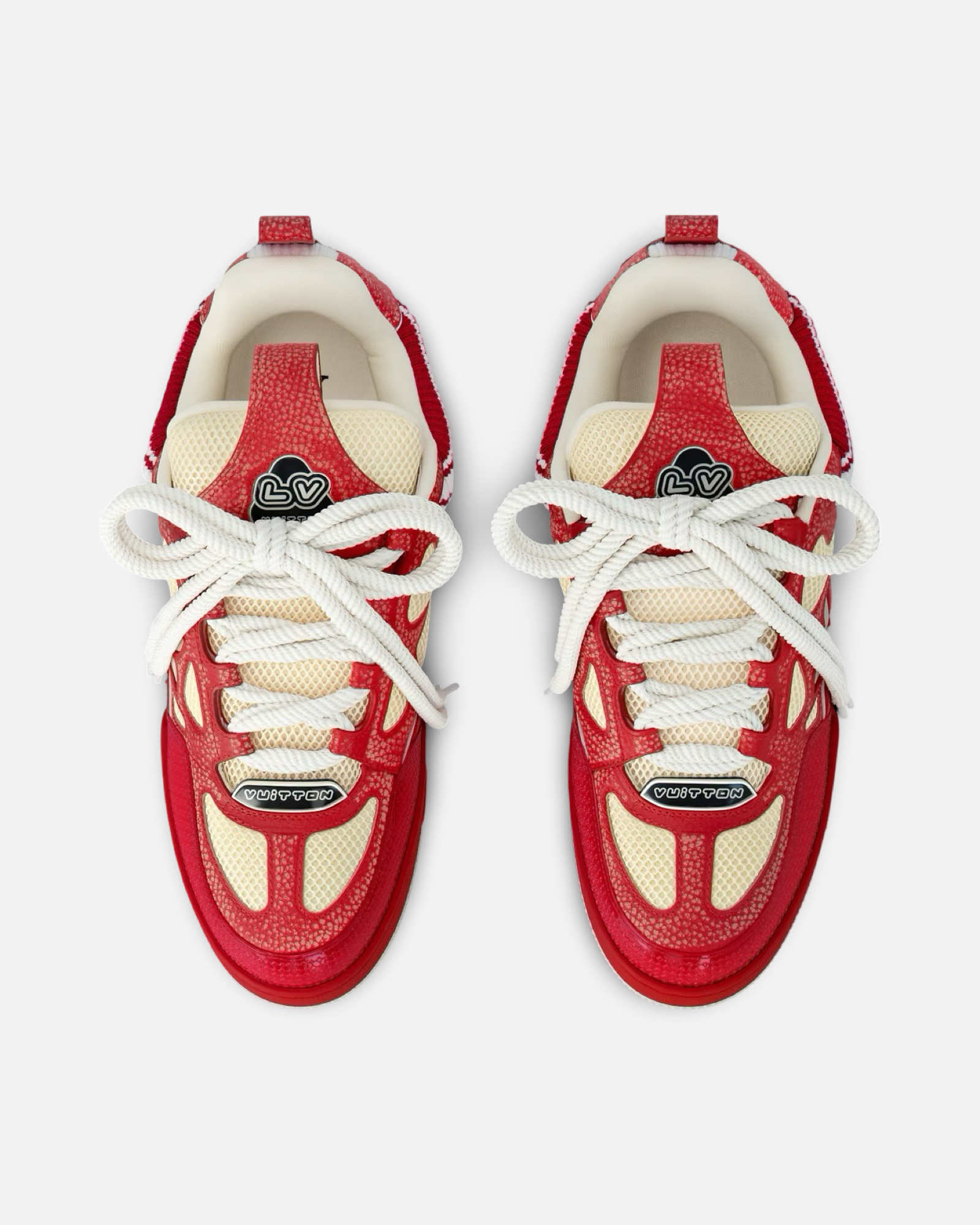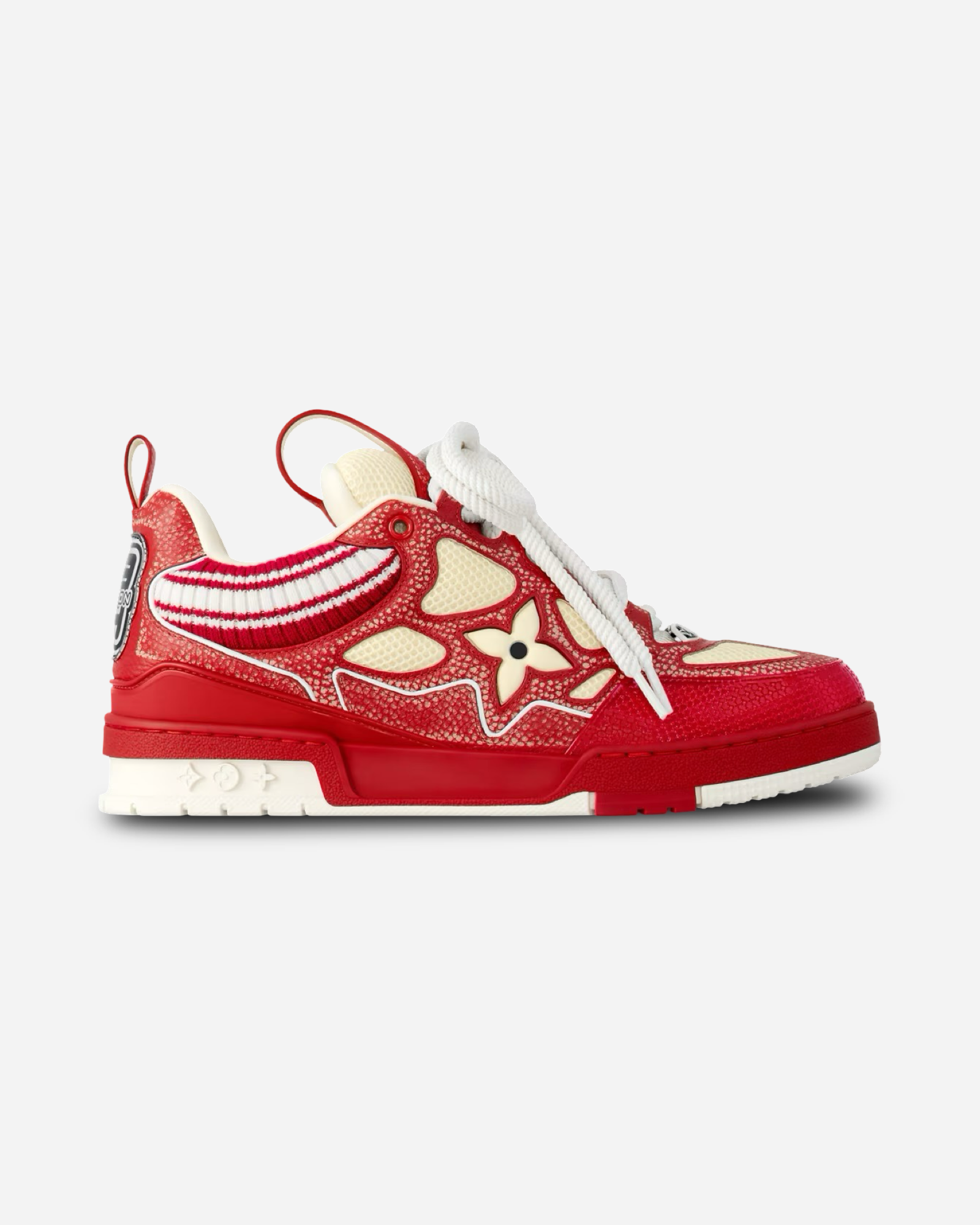 This edition of the LV Skate sneaker in vintage-look calf leather draws inspiration from varsity jackets for its distinctive knitted collar. Referencing Nineties' skate shoes, this model is characterized by its exaggerated tongue and multiple signature details, including a Monogram Flower on the side. It is finished with a two-tone rubber outsole adapted from the LV Trainer sneaker.