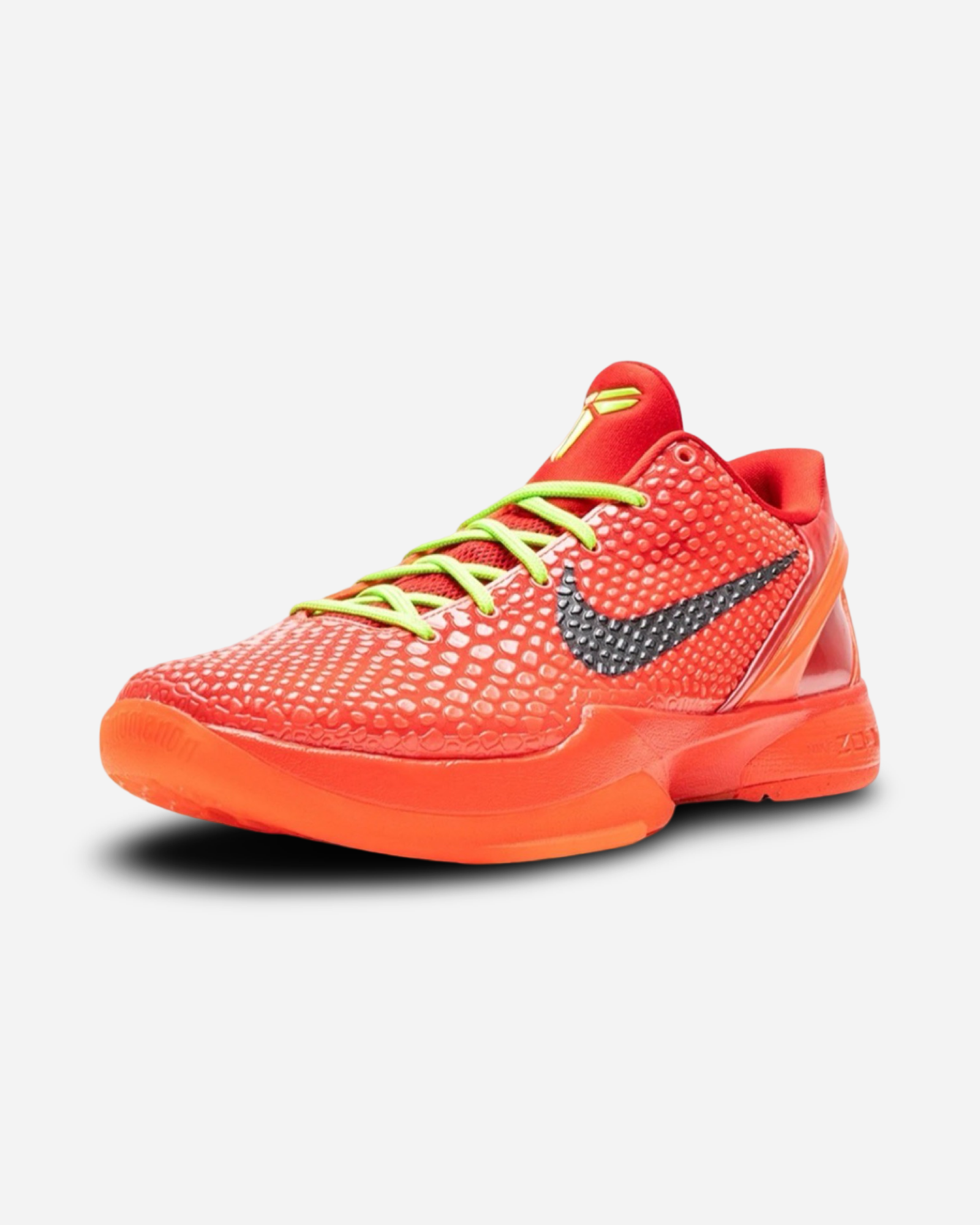 The Nike Zoom Kobe 6 Protro "Reverse Grinch" is an alternate version of the popular, Christmas-inspired colorway of Kobe Bryant’s sixth signature shoe. Inspired by the mostly all-green Nike Kobe 6 “Grinch” colorway, the “Reverse Grinch” flips the original design’s color block to feature a red upper with green laces. The shoe is complete with a Bright Crimson snakeskin textured upper with black Swooshes on the sides. Both the laces and Kobe’s “The Sheath” logo are designed in Electric Green. A Bright Crimson rubber sole completes the look. Release date: December 16, 2023